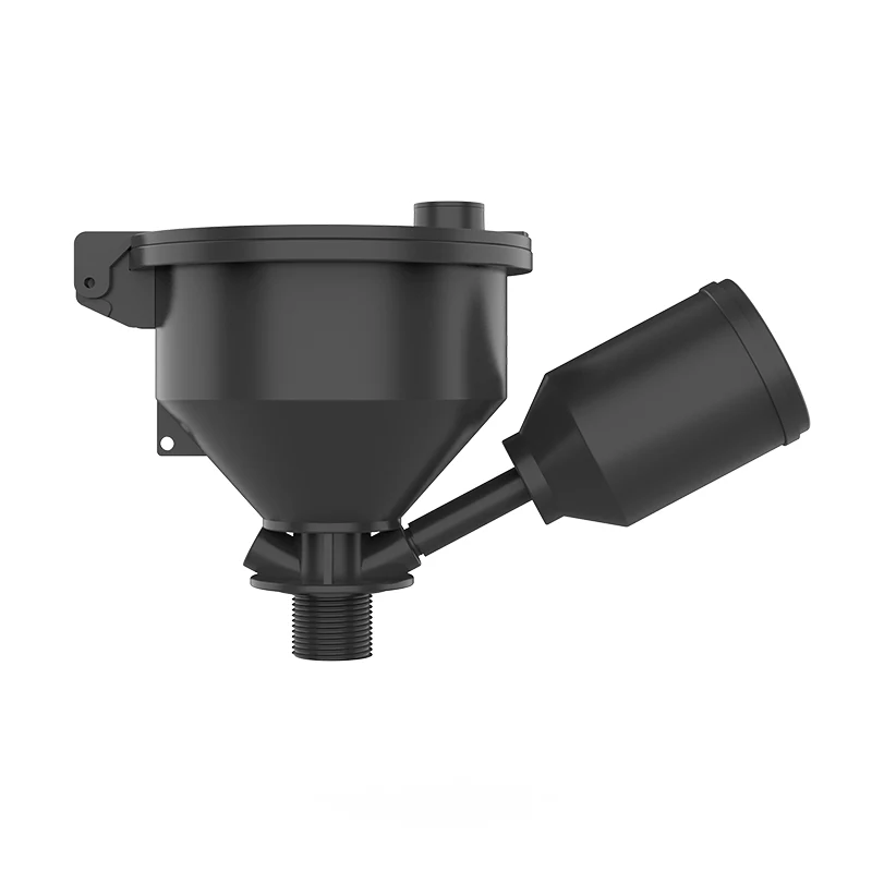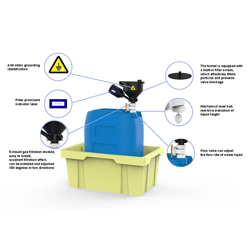 Diameter bagian dalam corong adalah 130mm dan diameter luar adalah 158mm. Ini mengadopsi desain penutup atas anti bocor. Bahan bakunya dicetak dengan injeksi dari bahan antistatis impor, dilengkapi dengan penutup segel dan desain corong filter tahan percikan. Katup opsional dapat dipasang di bawah corong untuk memastikan keamanan cairan limbah yang disegel. Penutup atas adalah tipe penyeimbang. Ketika tekanan internal mencapai 100Pa, penutup atas akan terbuka secara otomatis untuk mengeluarkan gas buang guna mencegah ledakan dan pembakaran spontan. Ketika tekanan kurang dari 50Pa, penutup akan menutup secara otomatis.